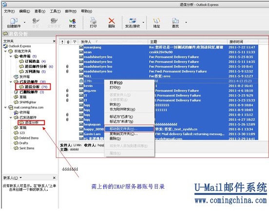 3、同样的方法,可以把本地电脑outlook express 的已发送文件夹的邮件移入imap 文件夹的发件箱中,成功同步到Webmail中。