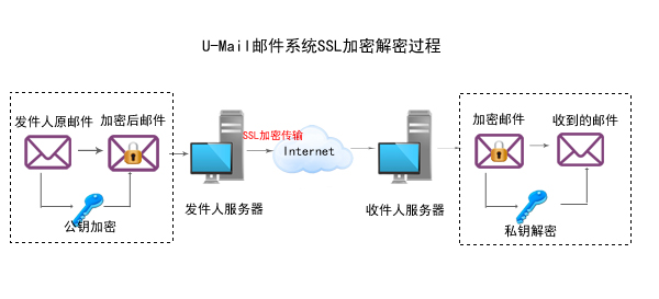 当用户登录web邮箱页面后,可以勾选“SSL安全登录”选项,则提交的数据会首先加密,再提交到邮箱,U-Mail邮件系统会对内容进行加密保护。加密解密过程如下图: